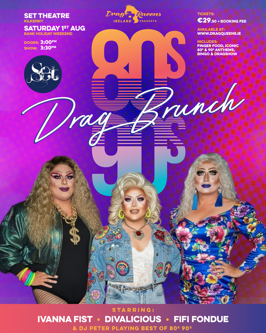 Step back in time and get ready for the ultimate throwback party as Drag Queens Ireland brings you the 80s & 90s Drag Brunch at Set Theatre, Kilkenny!